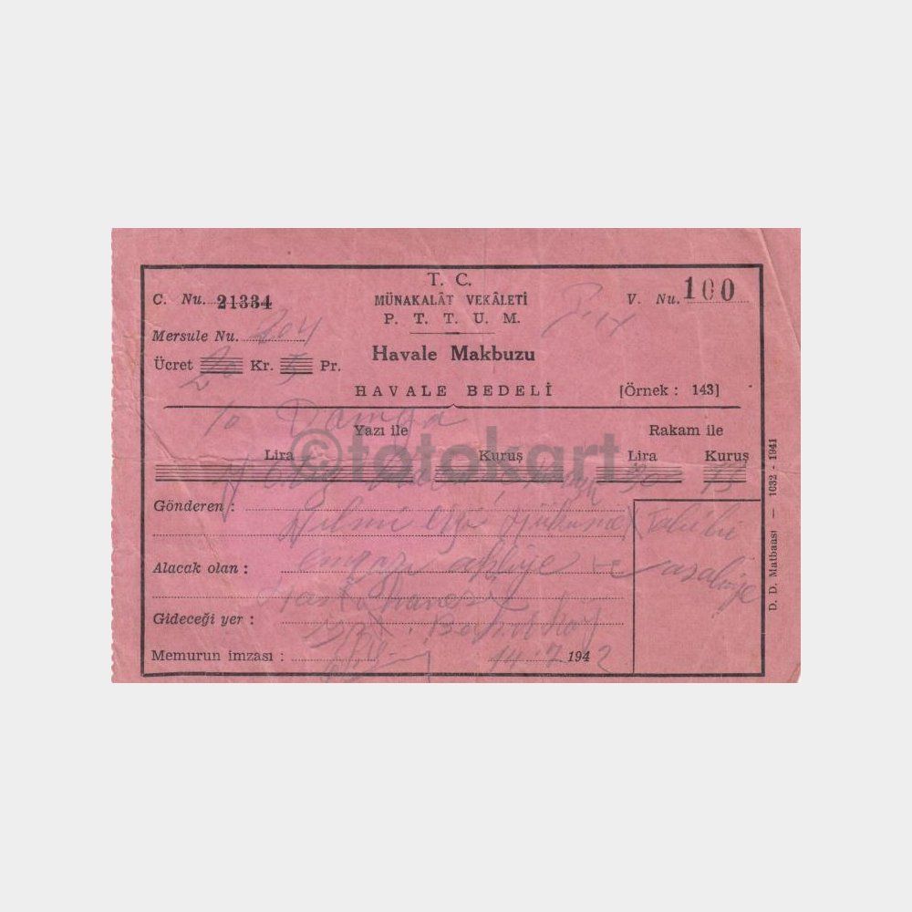 Eski posta makbuzu, pullu damgalı.