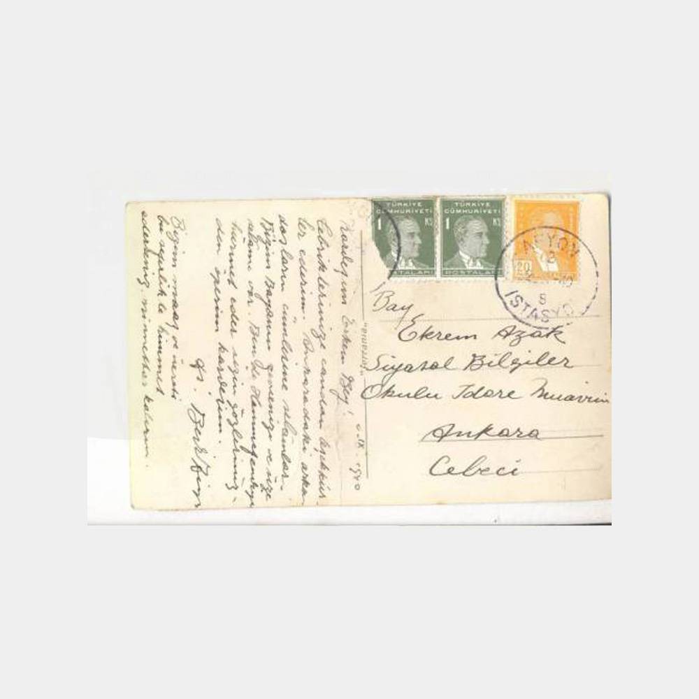 Afyon istasyon posta damgası ile damgalı 2. 8. 1949 tarihli, Ekrem Azak, siyasal bilgiler okulu idare muavini Cebeci Ankara adresli, ortadan tamirli durumda