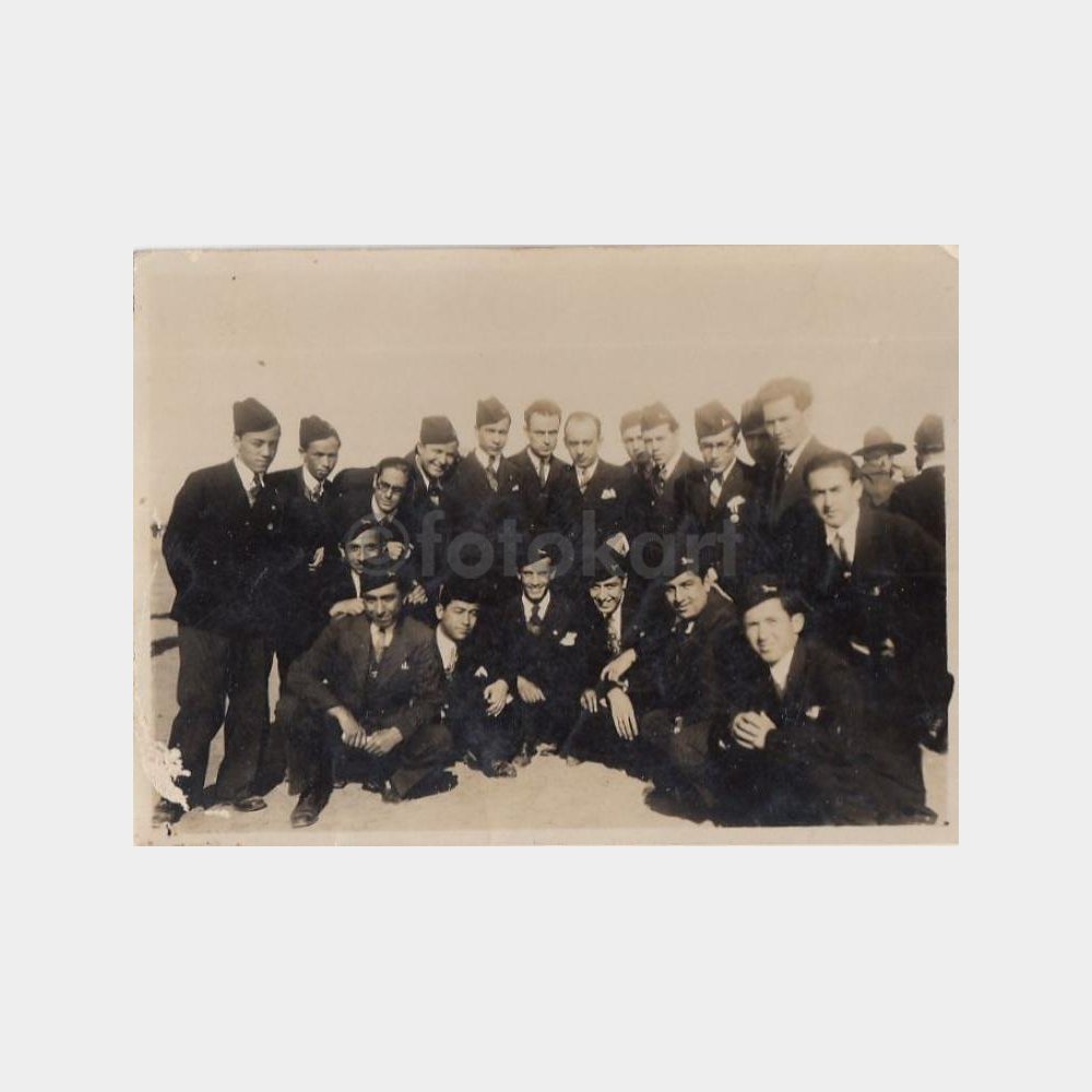 12 x 9 cm ebadında, arkası yazılı, belgesel fotoğraf, turnuvaya gelmiş güreşçi grubu olabilir, tarih tahmini.