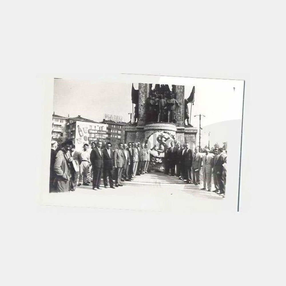 6,5 x 9,5 cm ebadında, arkasında Türkiye İş Bankası 1950 yılında kuruluşunun 36. Yılında taksimde cumhuriyet anıtına çelenk koyarken