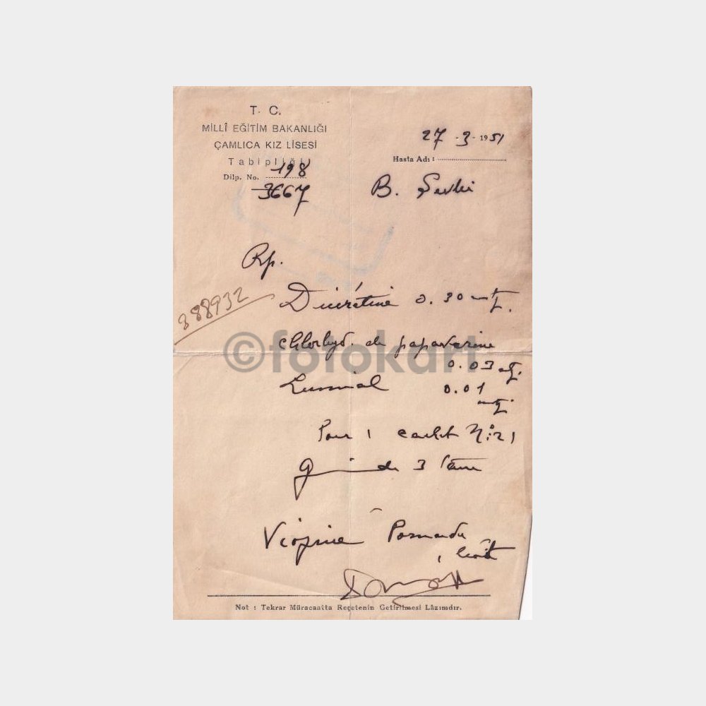 “1951 Çamlıca Kız Lisesi Reviri Doktor Reçetesi (Eczane Damgalı)” için yorum yapan ilk kişi siz olun