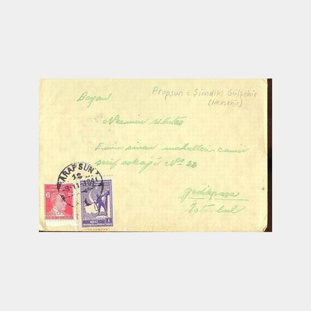 1951 Nevşehir Arapsun damgalı nadir zarf, 08. 11. 1941 tarihli Arapsun adı Gülşehir olarak değiştirildi. Nadir damgalı zarf