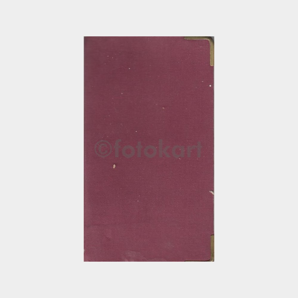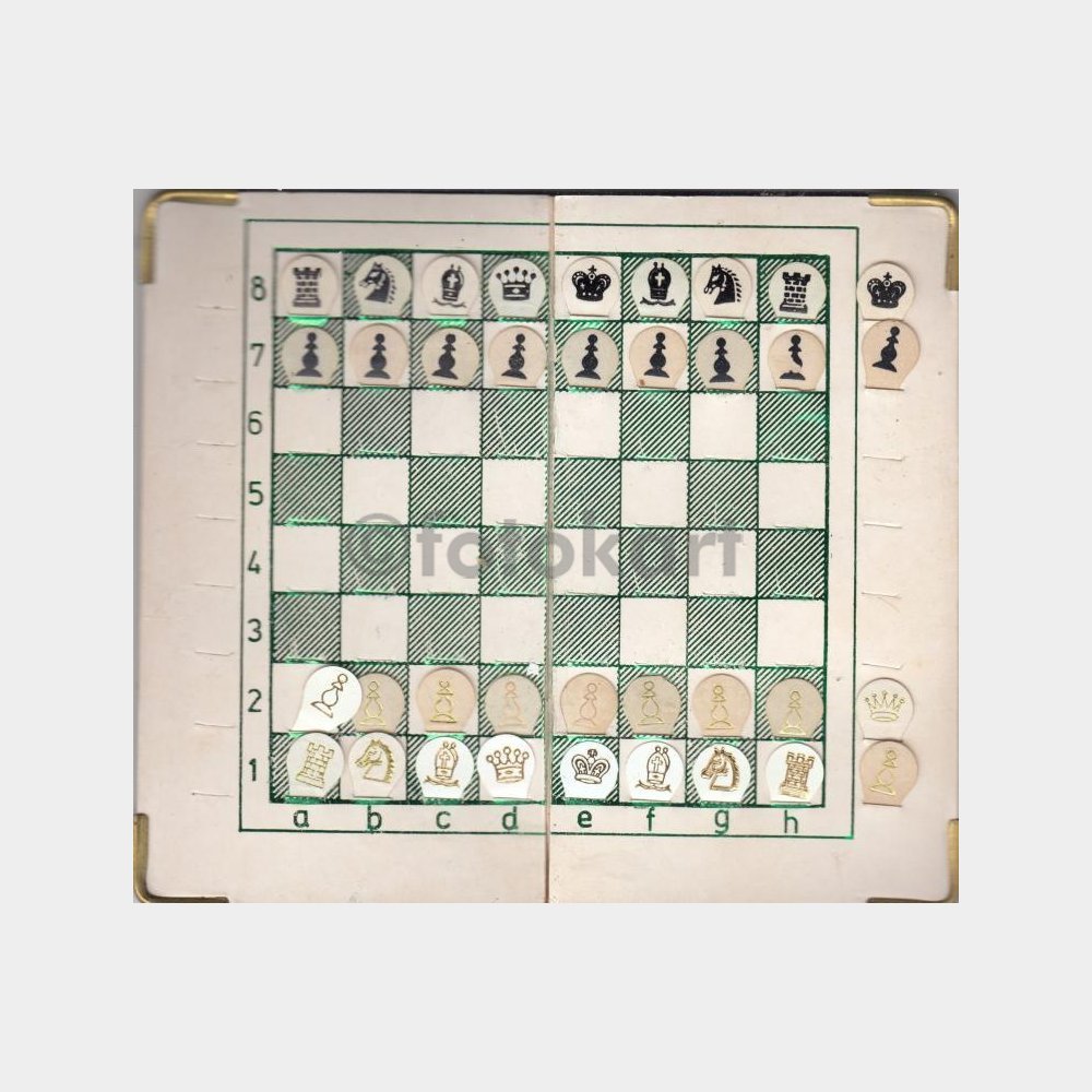 15 x 17 cm’dir. Kırmızı cilt kapaklı – ikiye katlanabilen cep satranç kartı. Üzerinde taşları yerine kağıt piyonları var -1950’li yıllara ait bir nostalji oyun kartıdır.