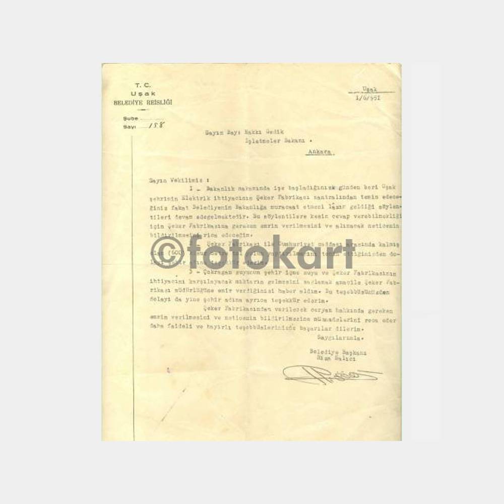 1951 Uşak Belediye Reisliği Teşekkür Yazısı