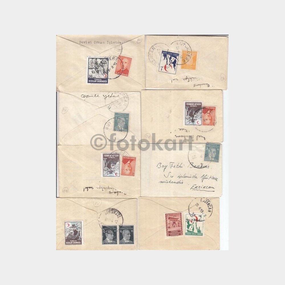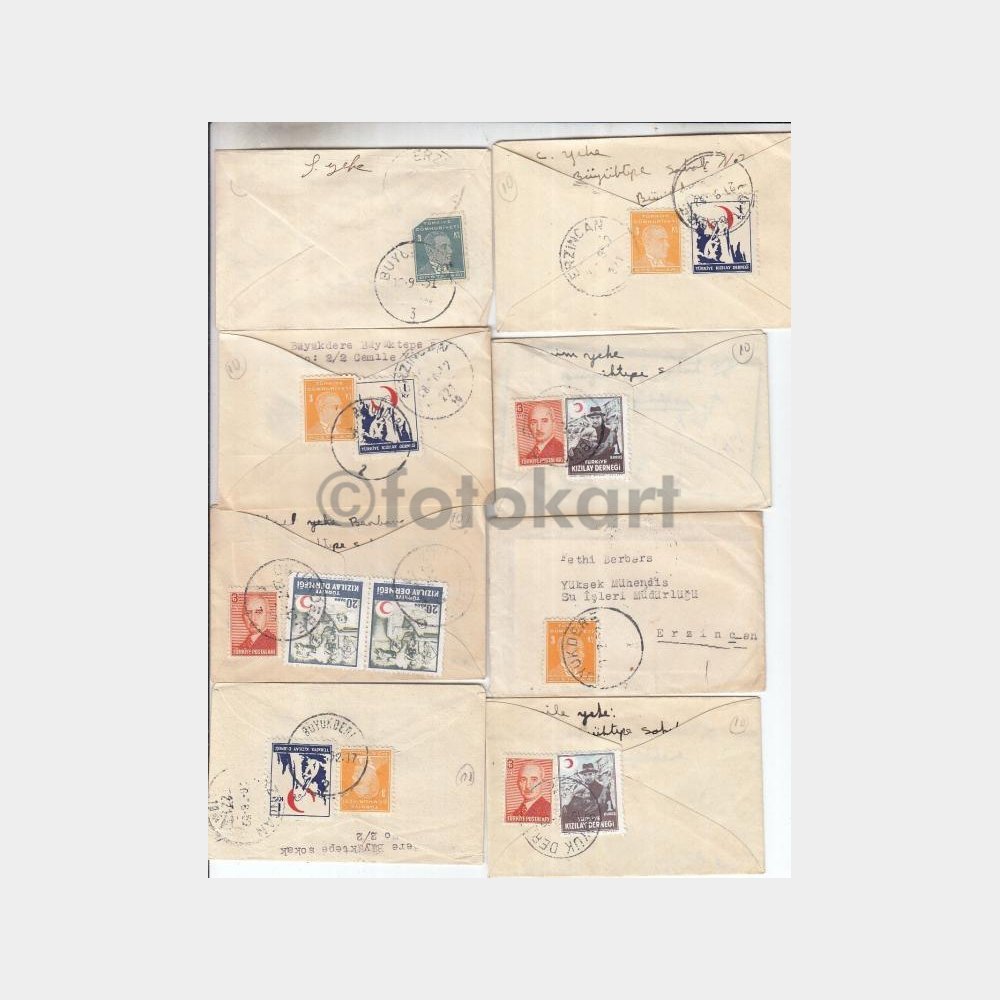 8 x 12 cm ebadında, koleksiyon amaçlı eski posta tebrik zarfları, 29 adet, çoğunluğu Erzincan varışlı-yardım pullu, zarfın içlerinde kartvizitleri mevcut.