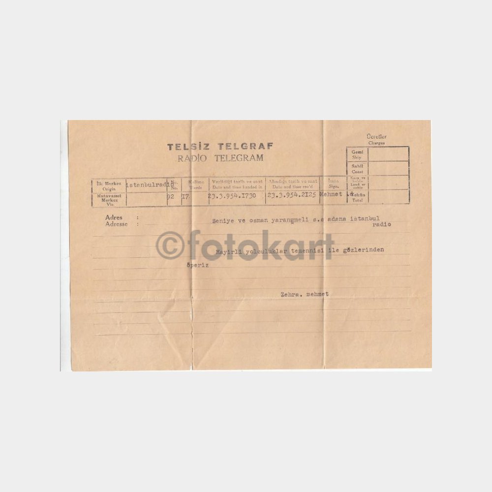 24 x 17 cm ebadında, koleksiyon amaçlı eski telgraf kağıdı. 1954.