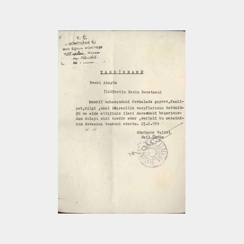Gümüşhane valisi Nail Öktem imzalı takdirname belgesi, orjinal nadir belgesel