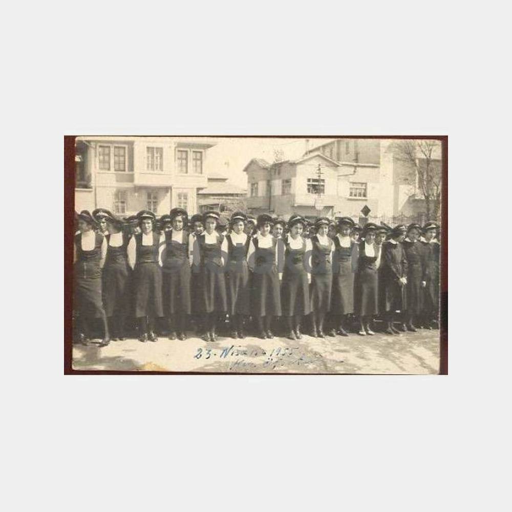1955 Erzurum kız öğrencileri tören fotoğraf, 23. 04. 1955 tarihi mevcut, arkası boş