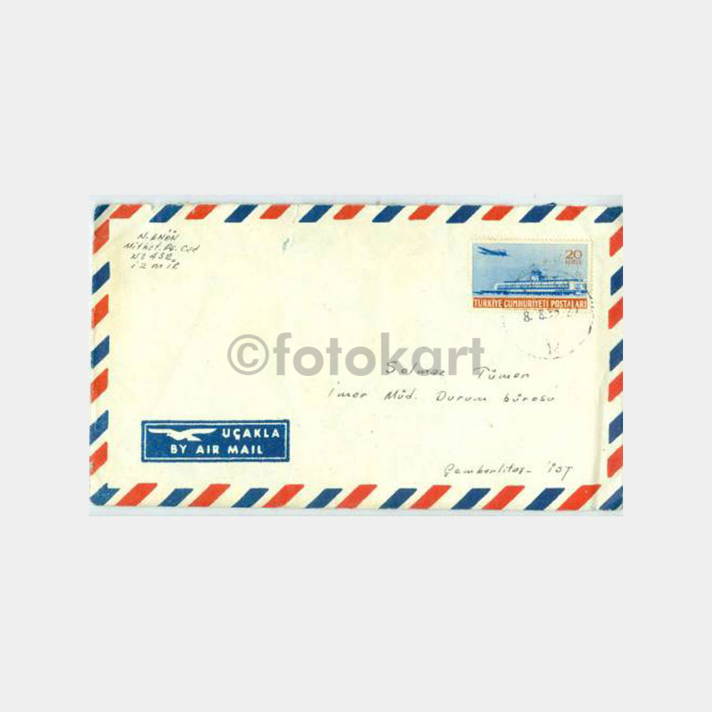 Üzerinde uçak pulu ve İzmir damgası olan zarf