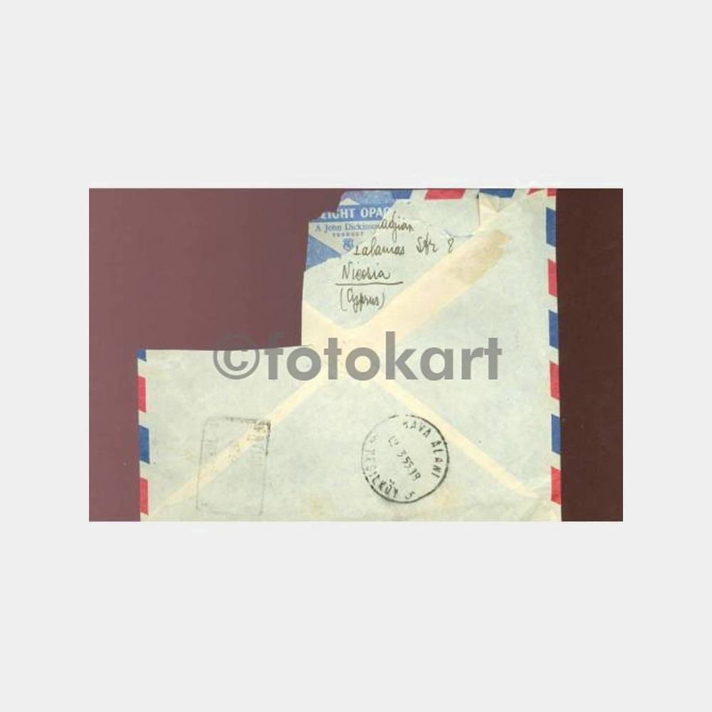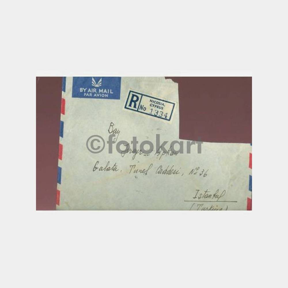 İçinde 4 sayfa yazılmış Ermenice mektubu var. Kıbrıs Lefkoşa taahhütlü etiketi, pul yeri kesik. Arkasında havaalanı Yeşilköy damgalı.