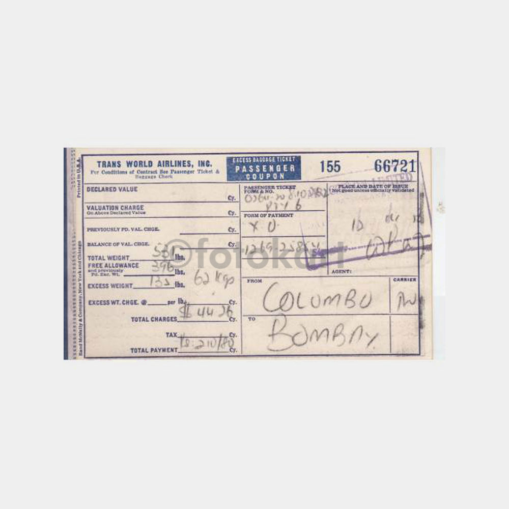 Çok temiz eski uçak bileti Seylan Colombo-Bombay Hindistan arası