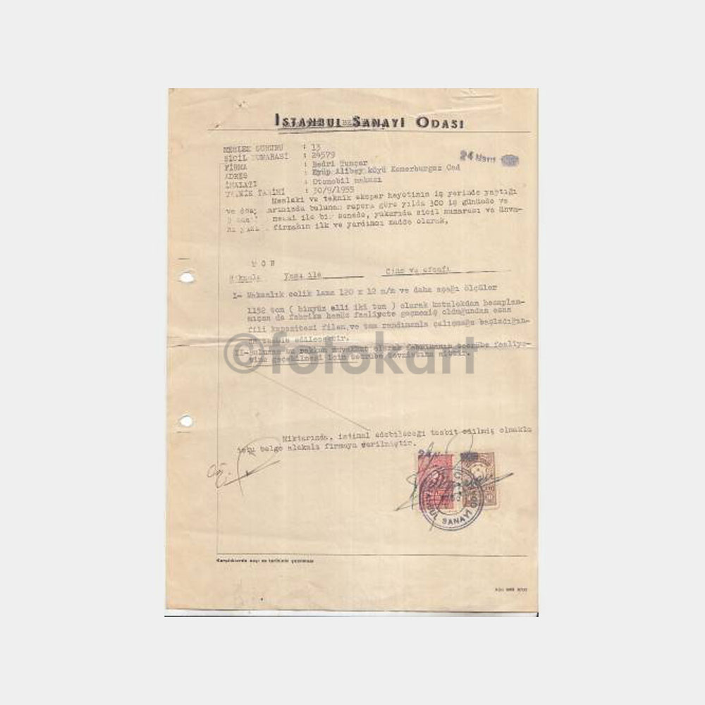 20 x 32 cm ebadında, koleksiyon amaçlı, eski İstanbul Sanayi Odası belgesi.