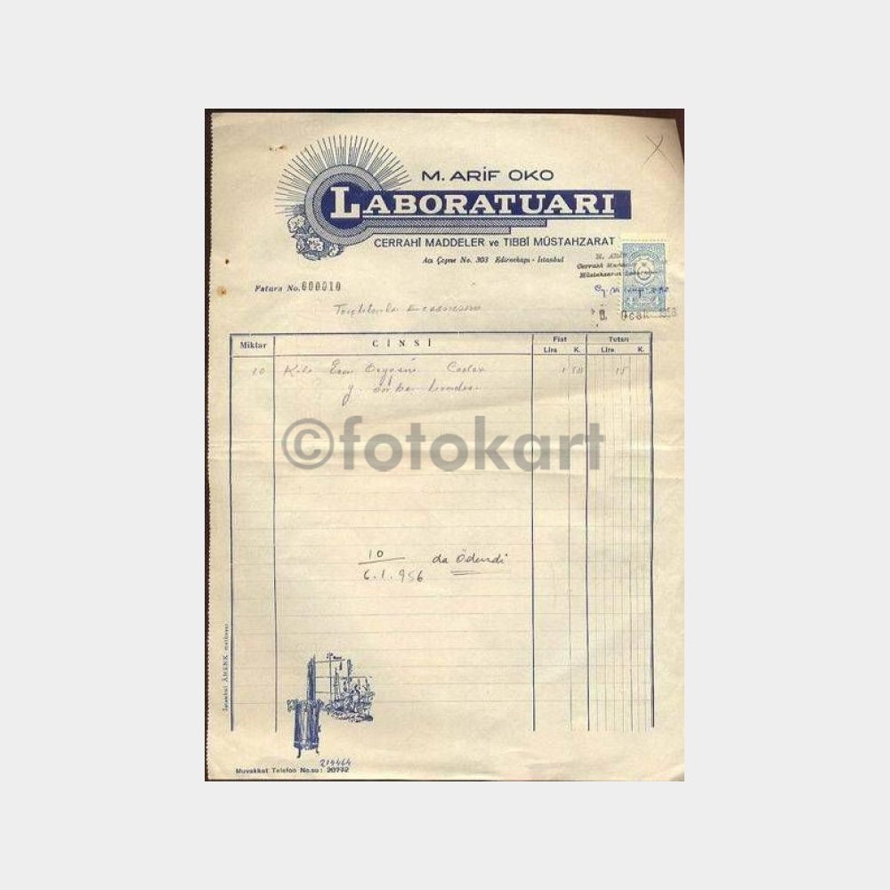 1956 M. Arif Oko Laboratuvar Faturası