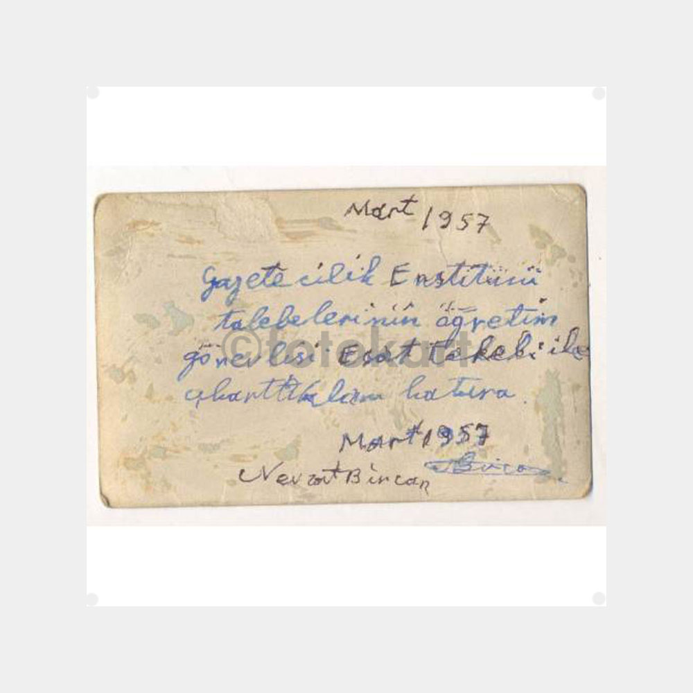 Arkasında , gazetecilik enstitüsü talebelerinin maliye bilimi öğretim görevlisi Esat Tekeli (maliye müfettişi )ile çıkarttıkları hatırası mart 1957