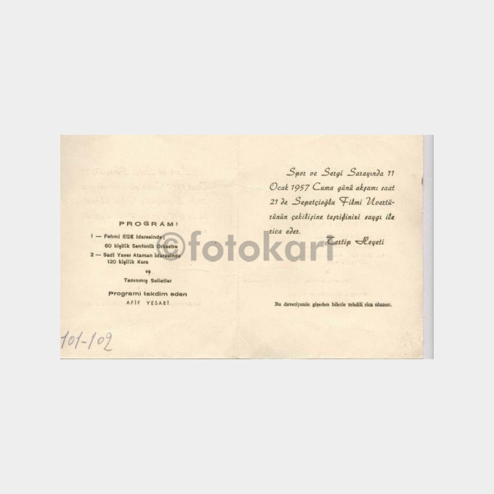 11.01.1957 tarihinde Spor ve Sergi Sarayı’nda Sepetçioğlu filmi uvertürünün çekilişi davetiyesi. Fehmi Ege ve Sadi Yaver Ataman koroları.