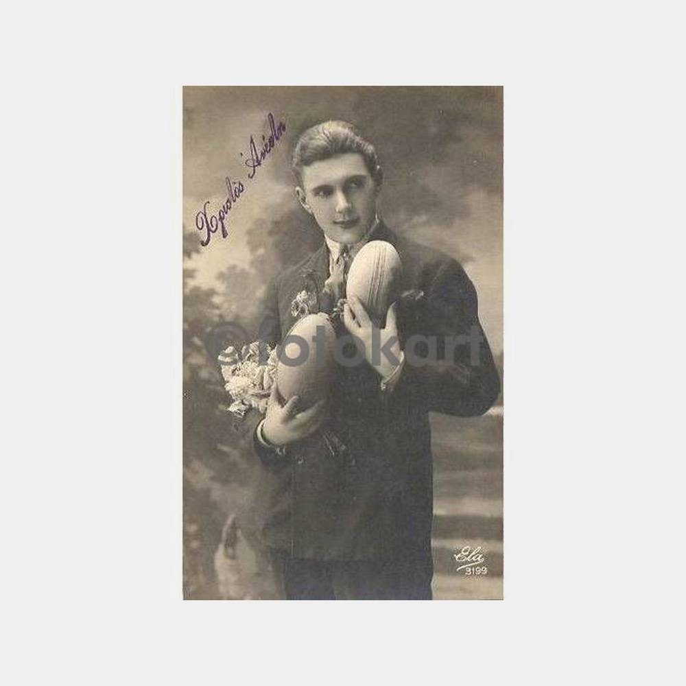 1958 bir bay ilginç fantazi kutlama kartı, arkası yazılı, elinde paskalya yumurtası şeklinde tarih 13. 4. 1958! Kondisyonu gayet iyi
