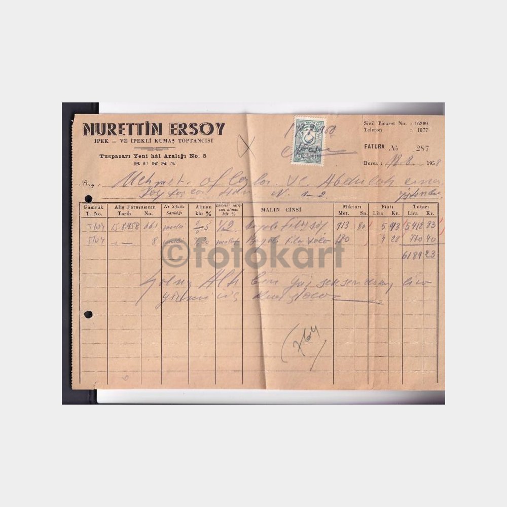 1958 İpek Kumaş Tekstil Dokuma Toptan Satış Faturası