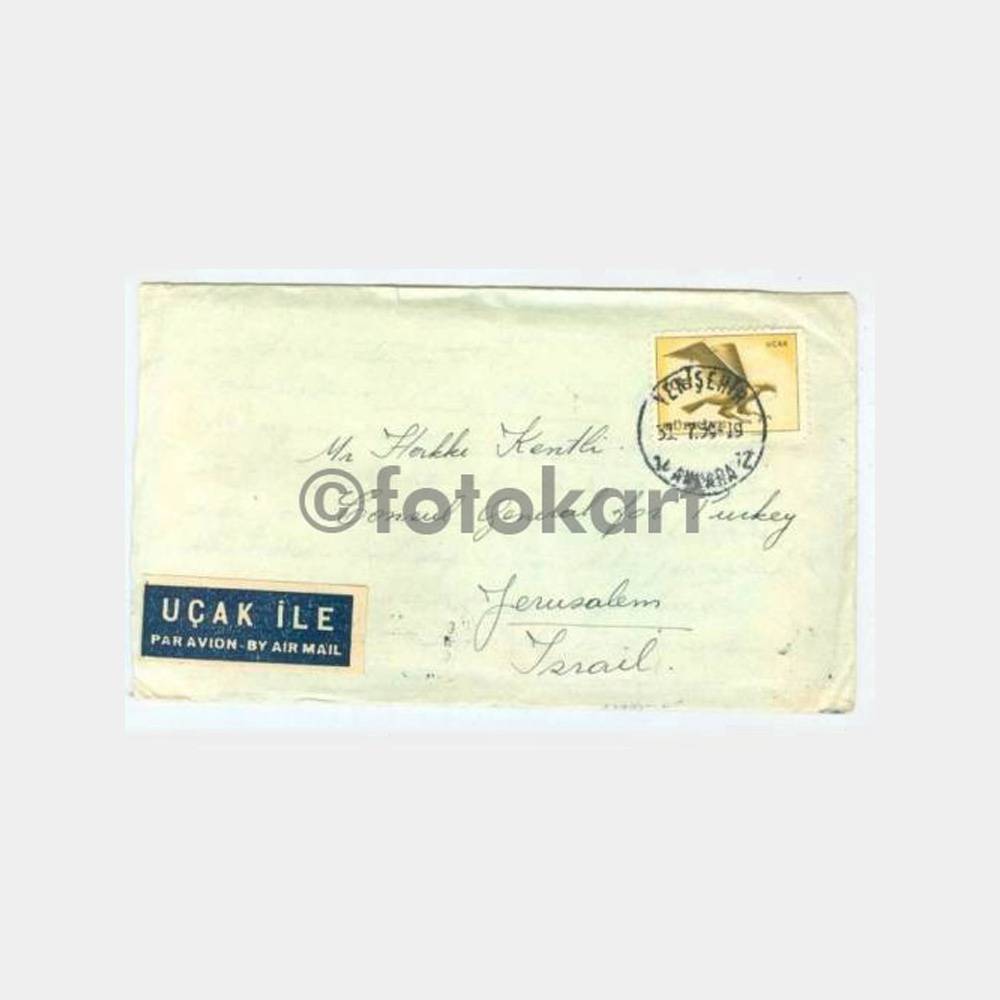 Yenişehir-Ankara posta damgası 31. 7. 1959 tarihli arkasında Kudüs varış damgası var