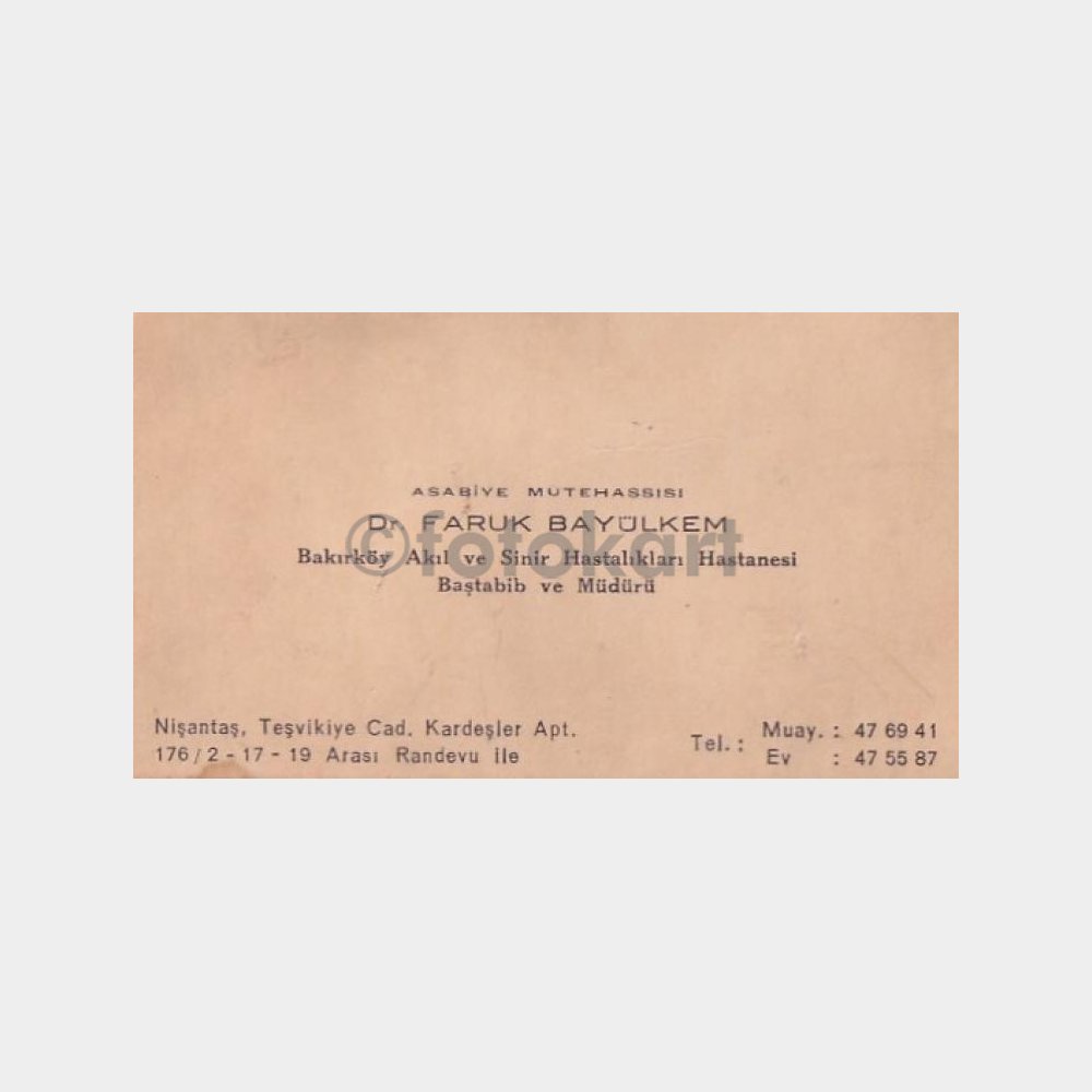 “1960 Bakırköy Asabiye Doktoru Faruk Bayülkem Kartviziti” için yorum yapan ilk kişi siz olun Yanıtı iptal et