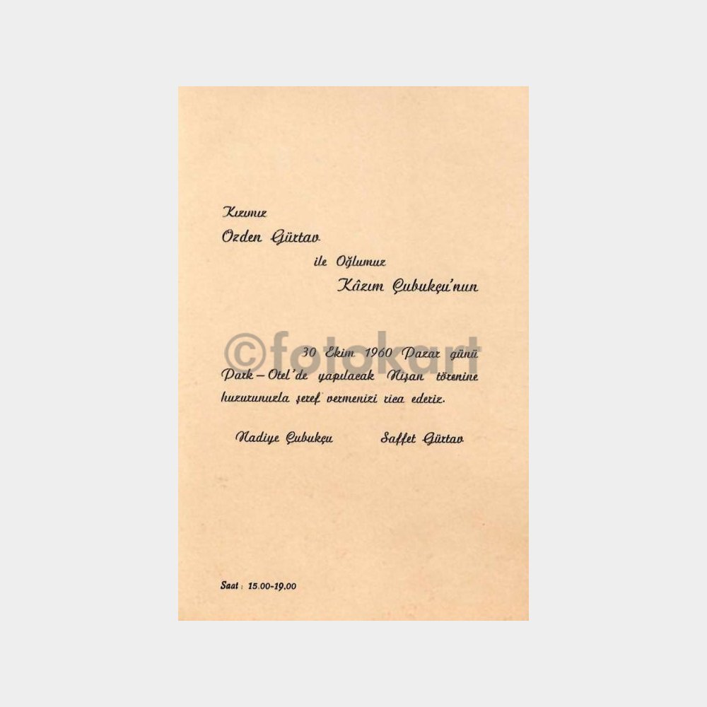 “1960 Beyoğlu Park Otel Nişan Davetiyesi” için yorum yapan ilk kişi siz olun