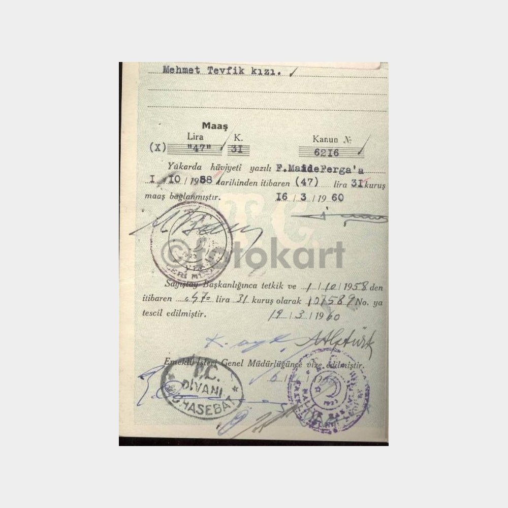 Özlük İşleri Müdürlüğü’nce tayin olunan tekaüt ve yetimlere mahsus -1960 yılında alınan borç para ile ilgili kart.