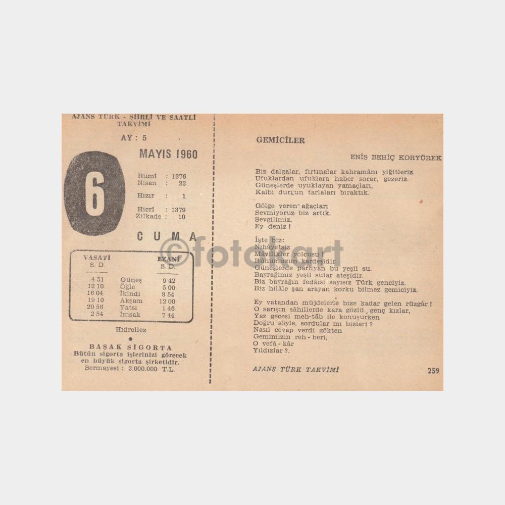 1960 Mayıs 6 – Ajans Türk Şiirli Takvim Yaprağı