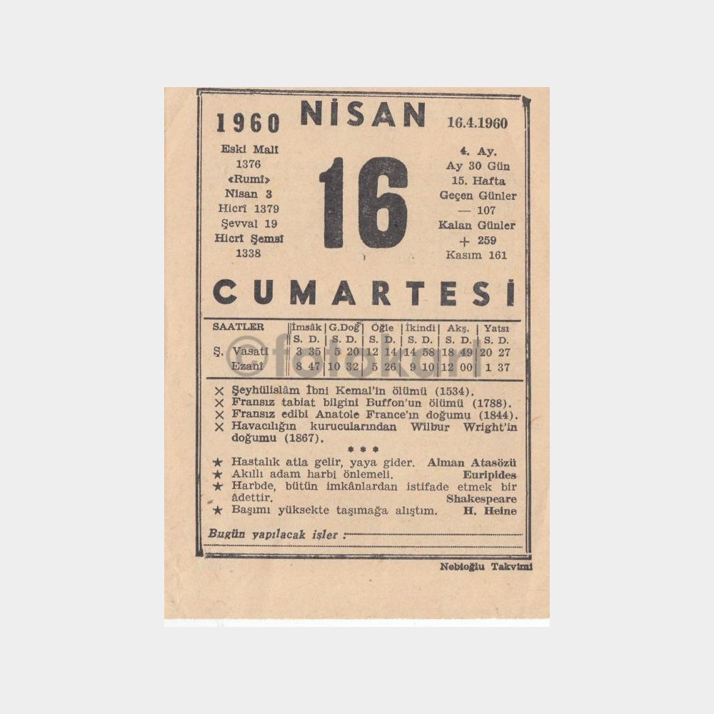 “1960 Nisan 16 – Nebioğlu Takvim Yaprağı” için yorum yapan ilk kişi siz olun
