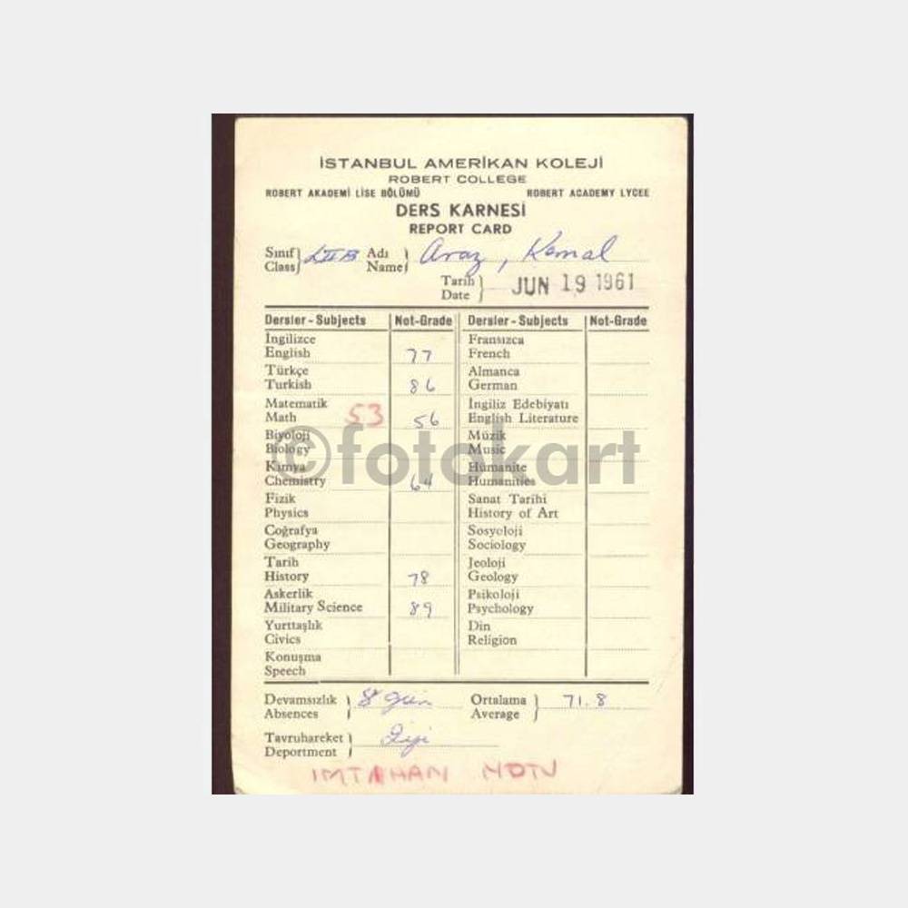 1961 Robert Kolej (Report Card) Ders Karnesi