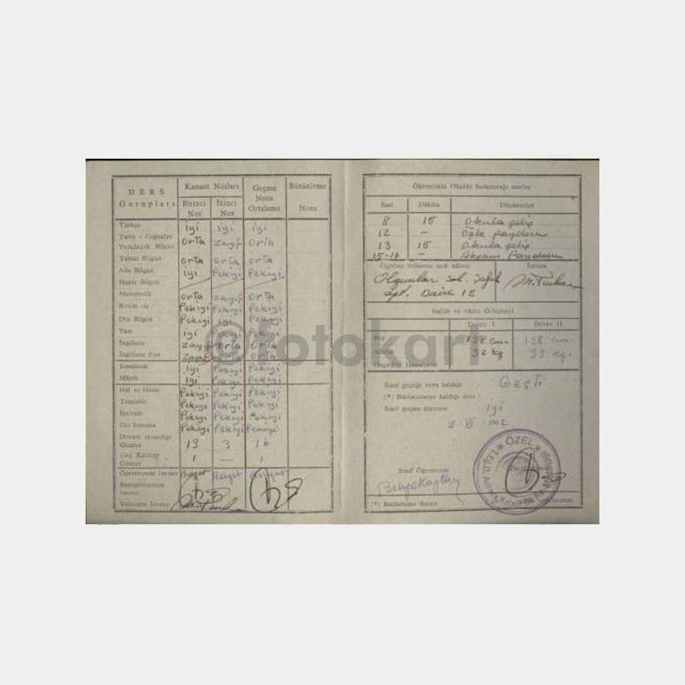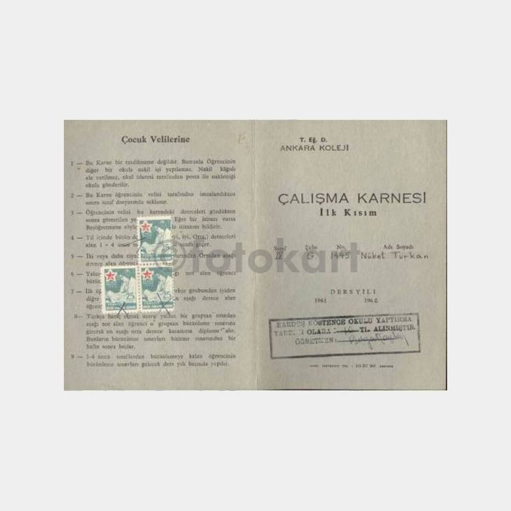 1961-1962 eğitim dönemine ait. Üzerinde 3 adet Çocuk Esirgeme Kurumu fiskal pulu var. Ayrıca üzerinde “Kardeş Köstence Okulu yaptırma yardımı olarak 10 TL alınmıştır.” damgası var.