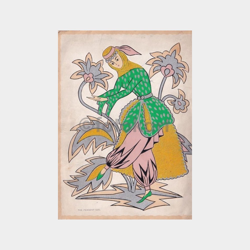 1962 Folklorik Kız İşleme Çiçek Baskılı Tebrik Kartı
