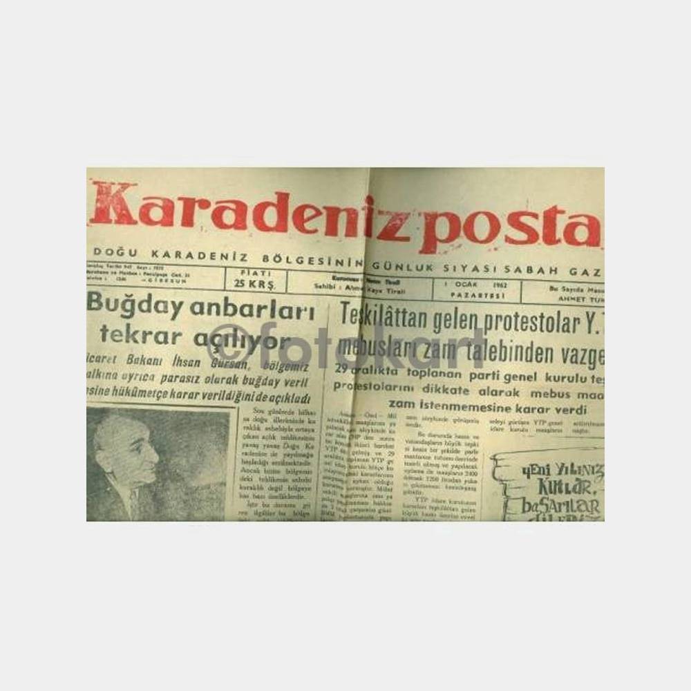 1962 yılına ait Giresun-Ahmet Kaya Tirali’nin kurucusu olduğu Karadeniz Postası gazetesi.