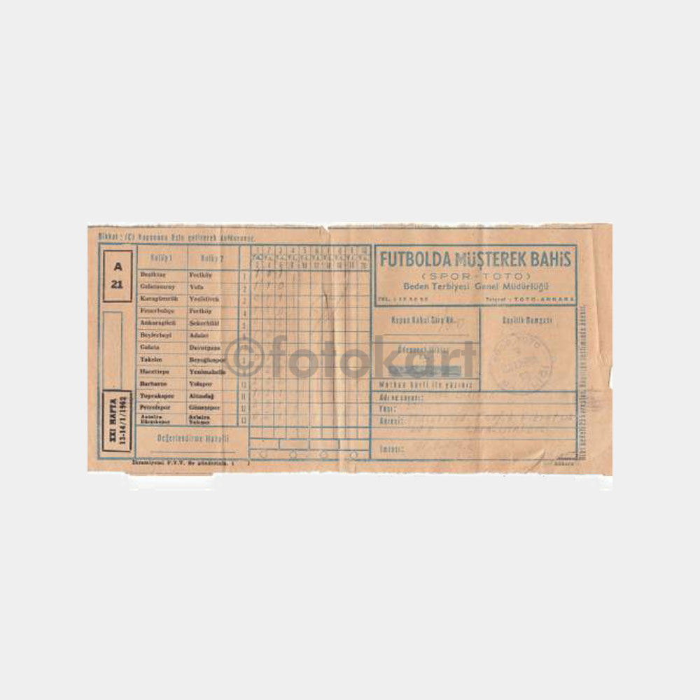 1962 tarihli, koleksiyon amaçlı, Spor Toto kuponu haliyle yazılı, oynanmış.