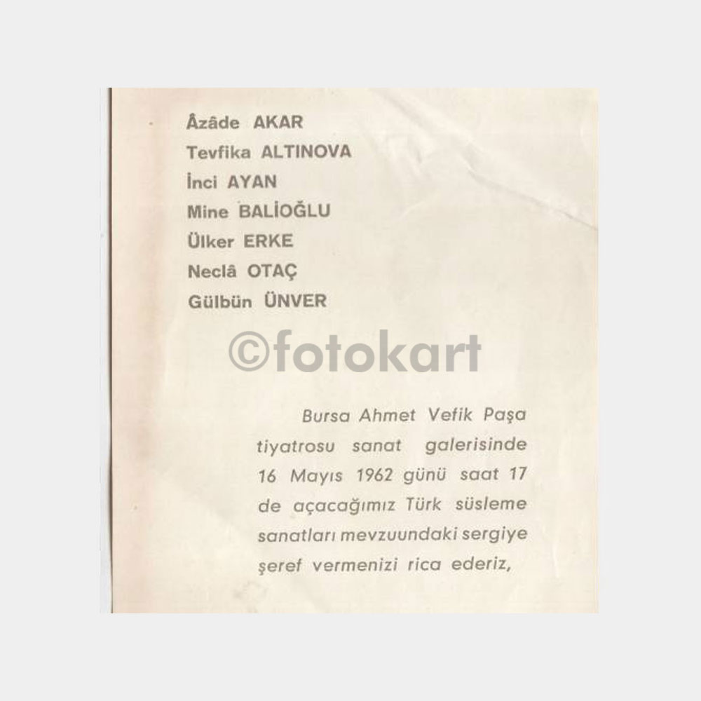 “1962 Türk Kadınlar Birliği Bursa Şubesi Sergi Davetiyesi” için yorum yapan ilk kişi siz olun