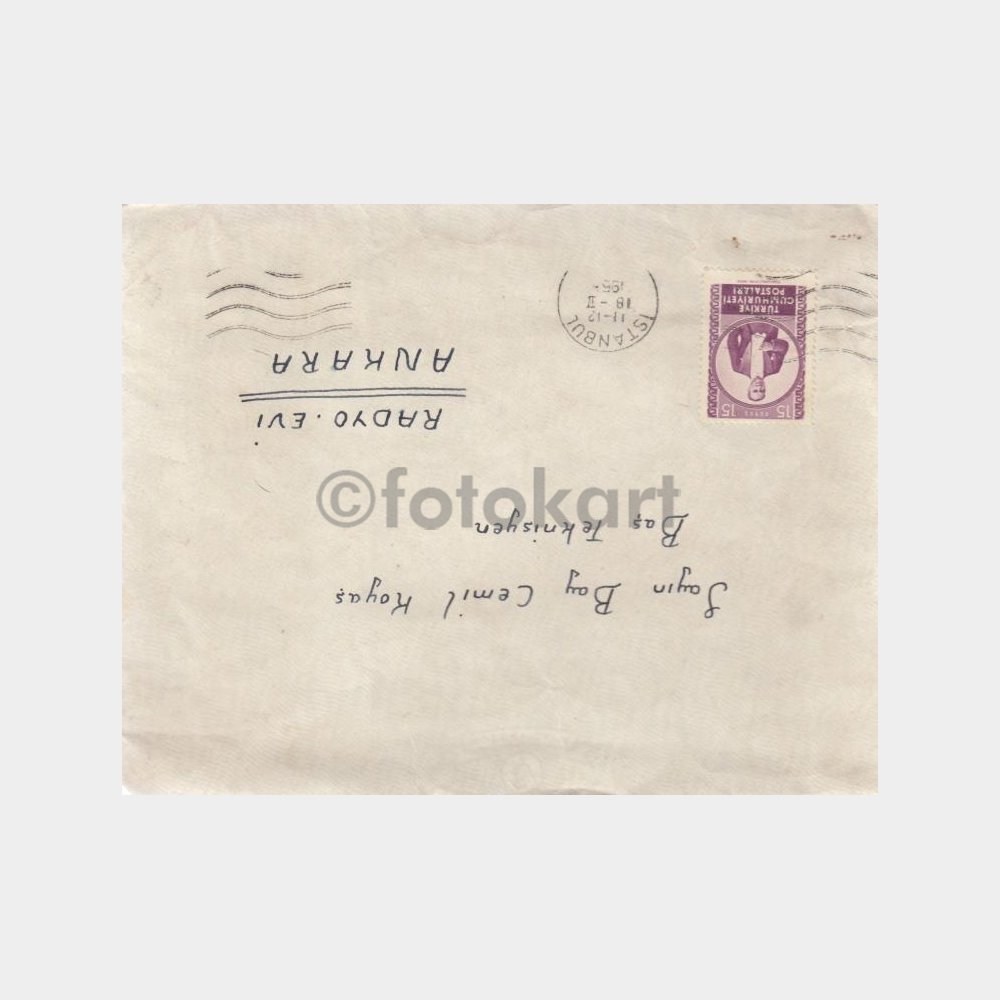 Damgalı pullu, radyo evi adresli şarkı istek mektubu zarfı.