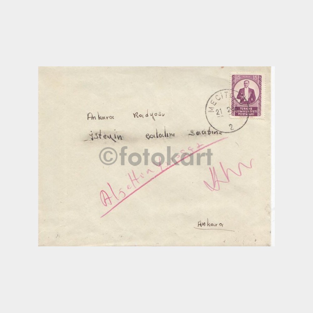 Damgalı pullu, radyo evi adresli şarkı istek mektubu zarfı.