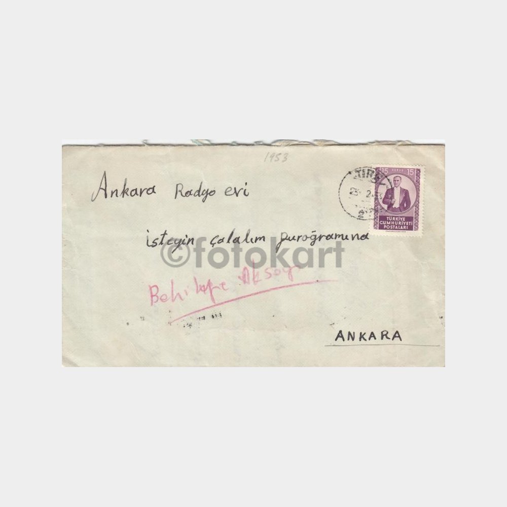 Damgalı pullu, radyo evi adresli şarkı istek mektubu zarfı.
