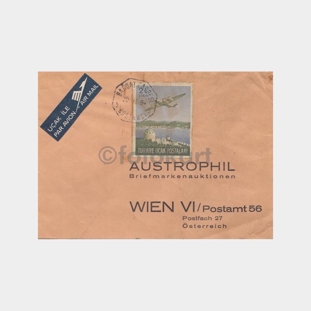 Sekizgen köşeli posta damgalı, Hisar resimli. Uçak pulu değil kesilmiş, etiket üzerinde damga var adresli mektup zarfı.