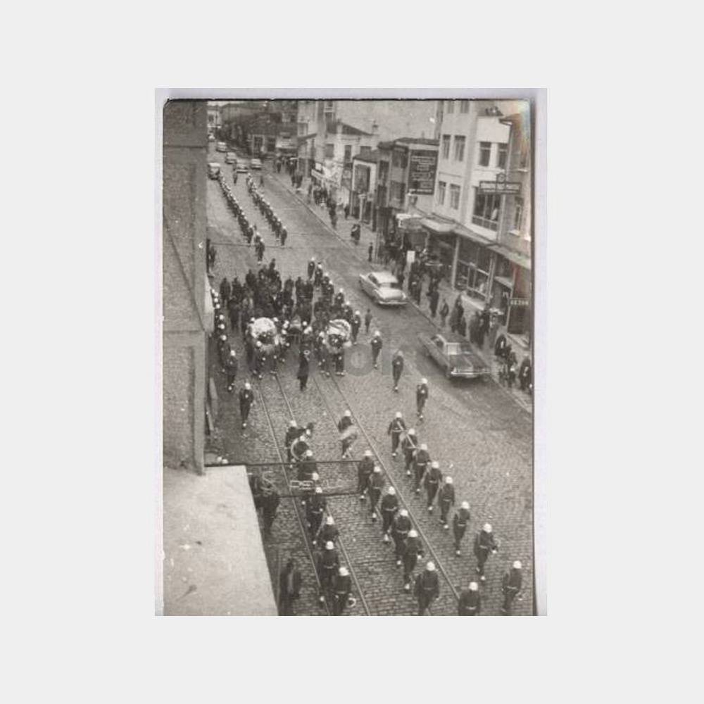 6 x 9 cm ebadında albümden çıkma, sağ yönde Türkiye İşçi Partisi levhası görülmekte, bir cenaze töreni yürüyüşü, Osmanağa cami istikametinde