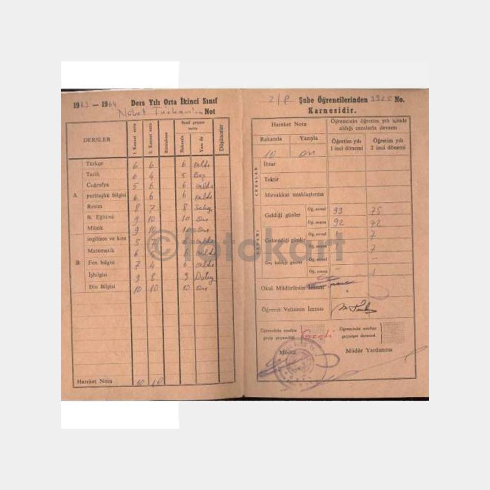 1964-1965 dönemi, orta 2. sınıf karnesi.