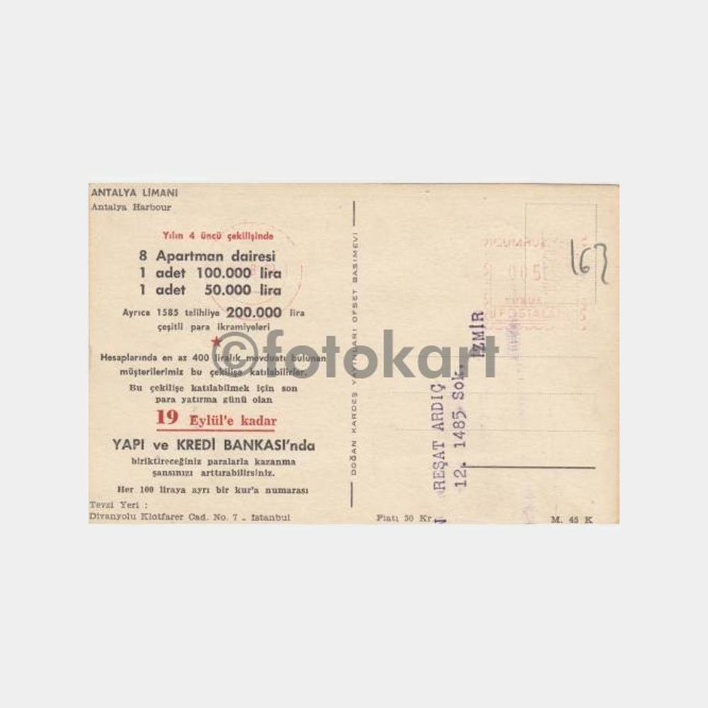 1965 Antalya Limanı İkramiye Baskılı Kartpostal