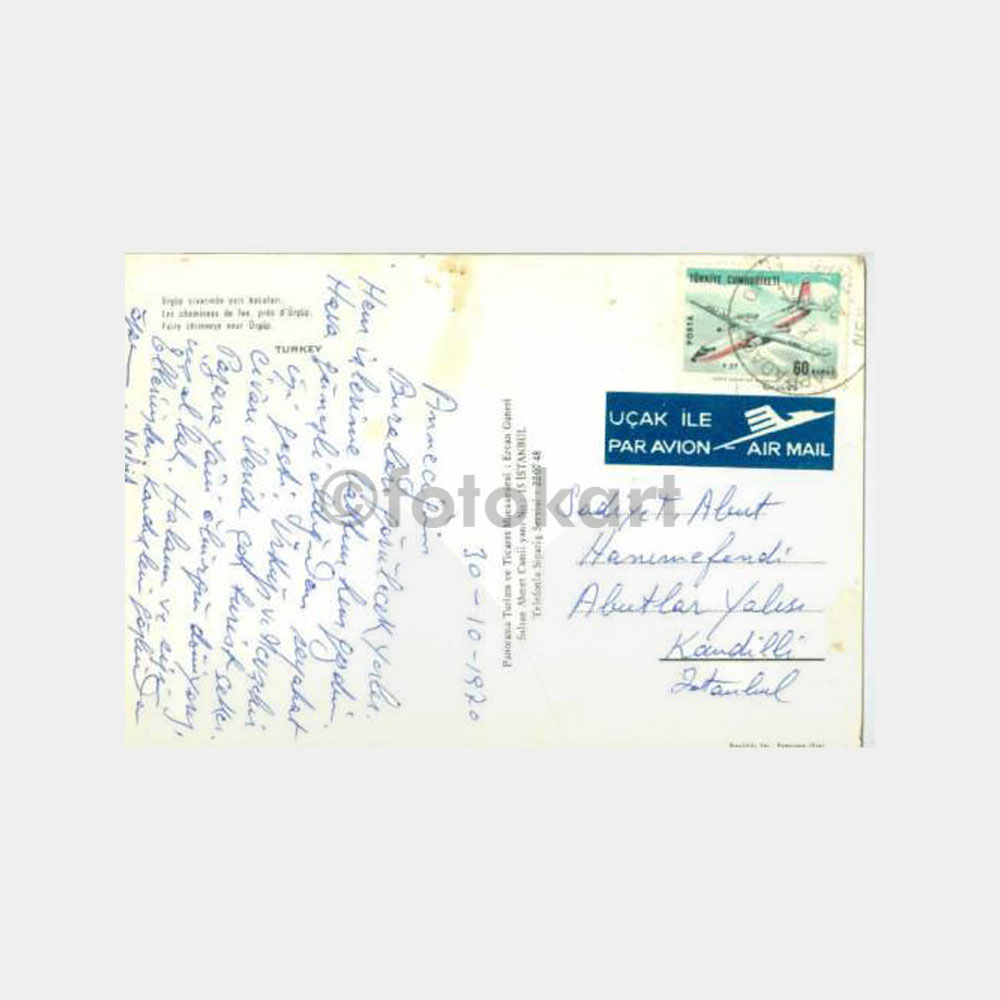 Arkası abut ailesi hitaben yazılı kartpostal üzerinde nevşehir capadocia oteli ile ilgili damgası var