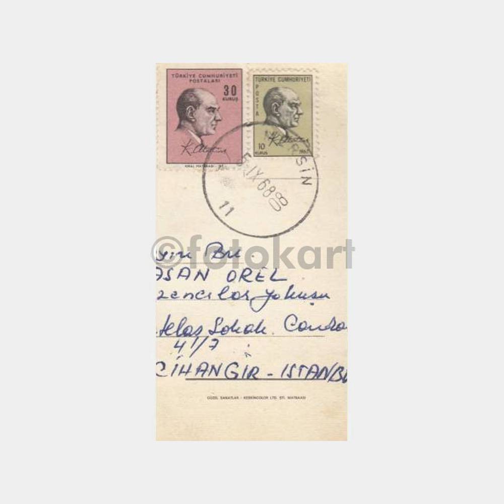 9 x 14 cm ebadında, arkası yazılı. Mersin posta damgalı baskı kartpostal.