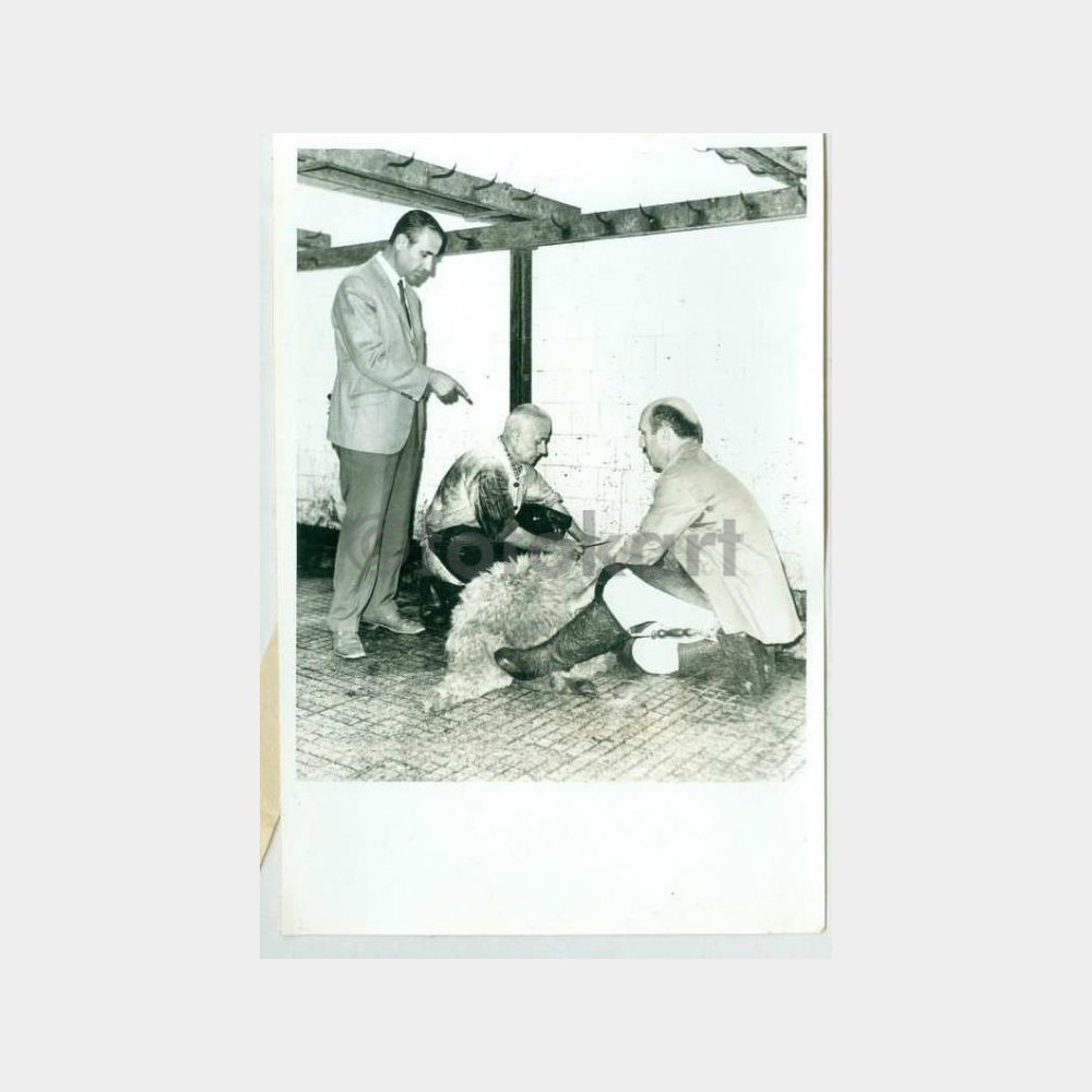 12 x 18 cm. ebadında arkası bant yapışık fotoğraf. Mezbahanın en eski kesicisi Faik Eryürek törenle hayatının 500 bininci koyunu keserken. Foto Yurt haber ajansı.