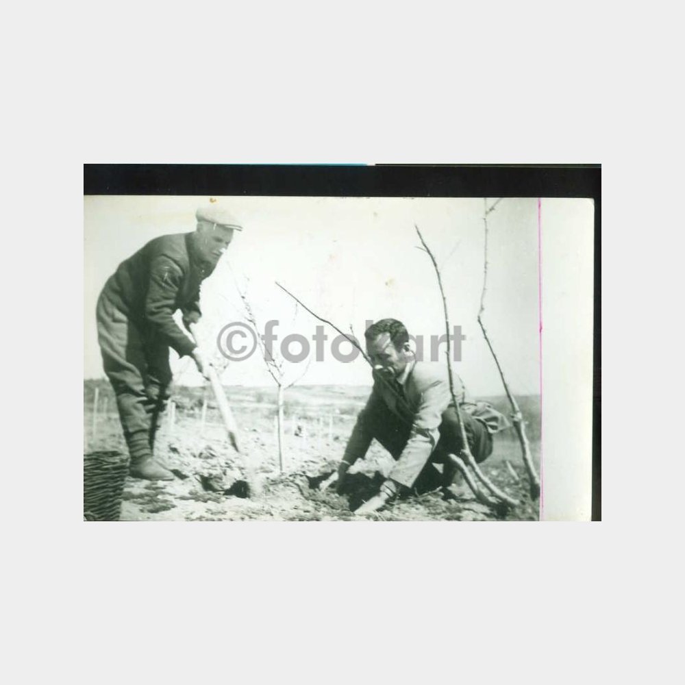 14 x 9 cm ebadında, arkası yazılı fotoğraf, Yeniceköy erozyon alanında raif Aksoy okul müdürü İbrahim Tura ile meşe tohumu ekiyor.