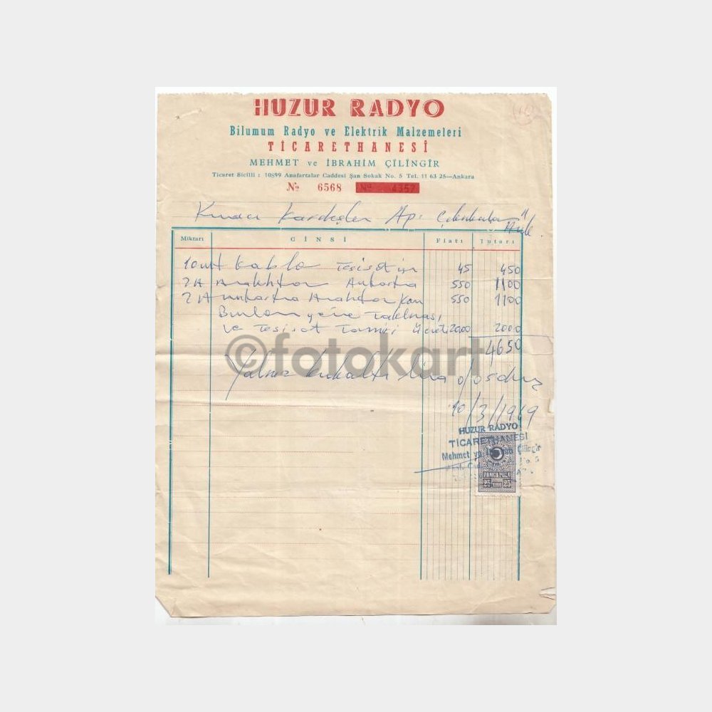 1969 Ankara Radyo Konulu Faturası