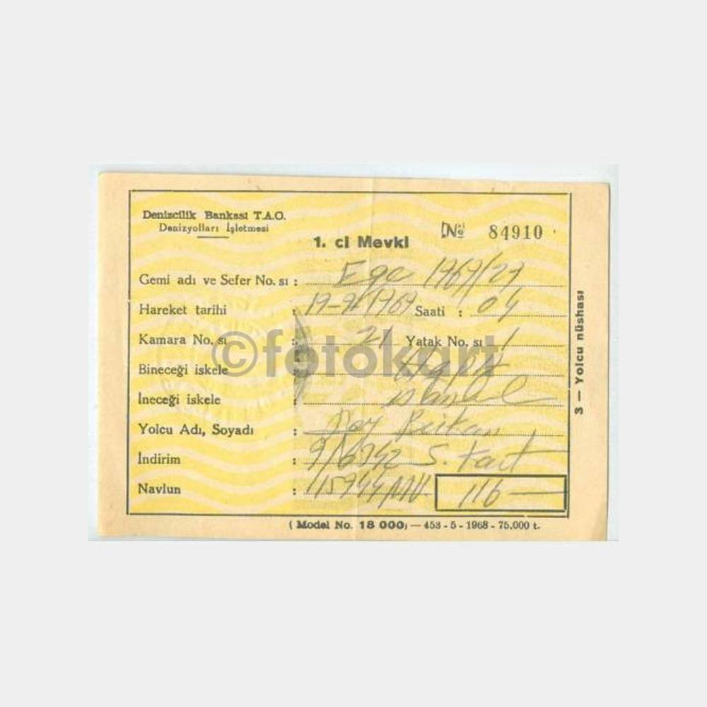 Ege vapuru 1969-29 nolu seferi 19. 9. 1969 tarihli bilet kolleksiyon amaçlı