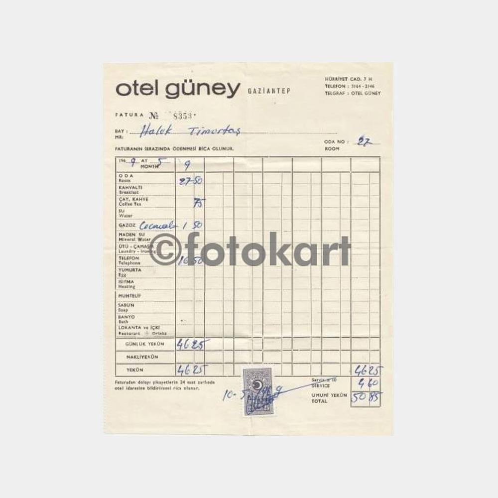 1969 Gaziantep Güney Otel Faturası