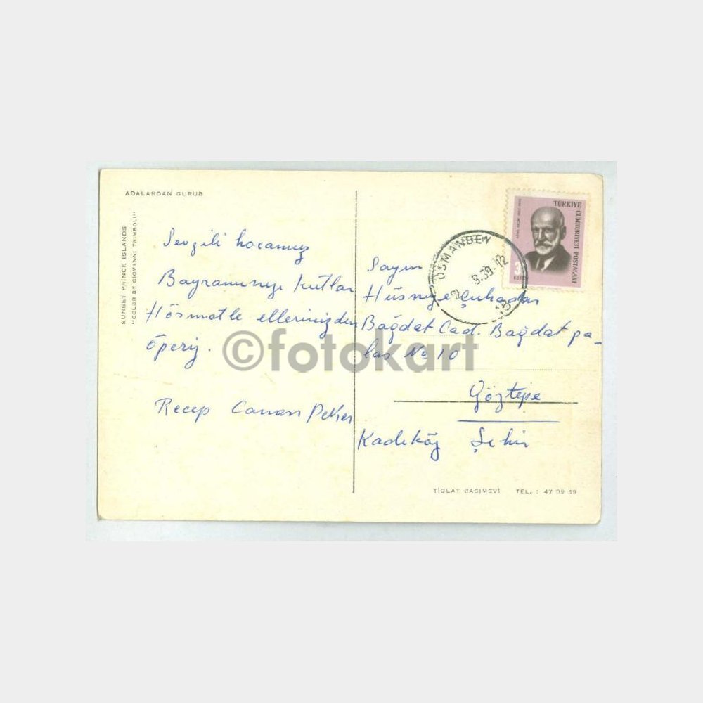 Arkası yazılı “İstanbul Osmanbey” posta damgalı kartpostal.