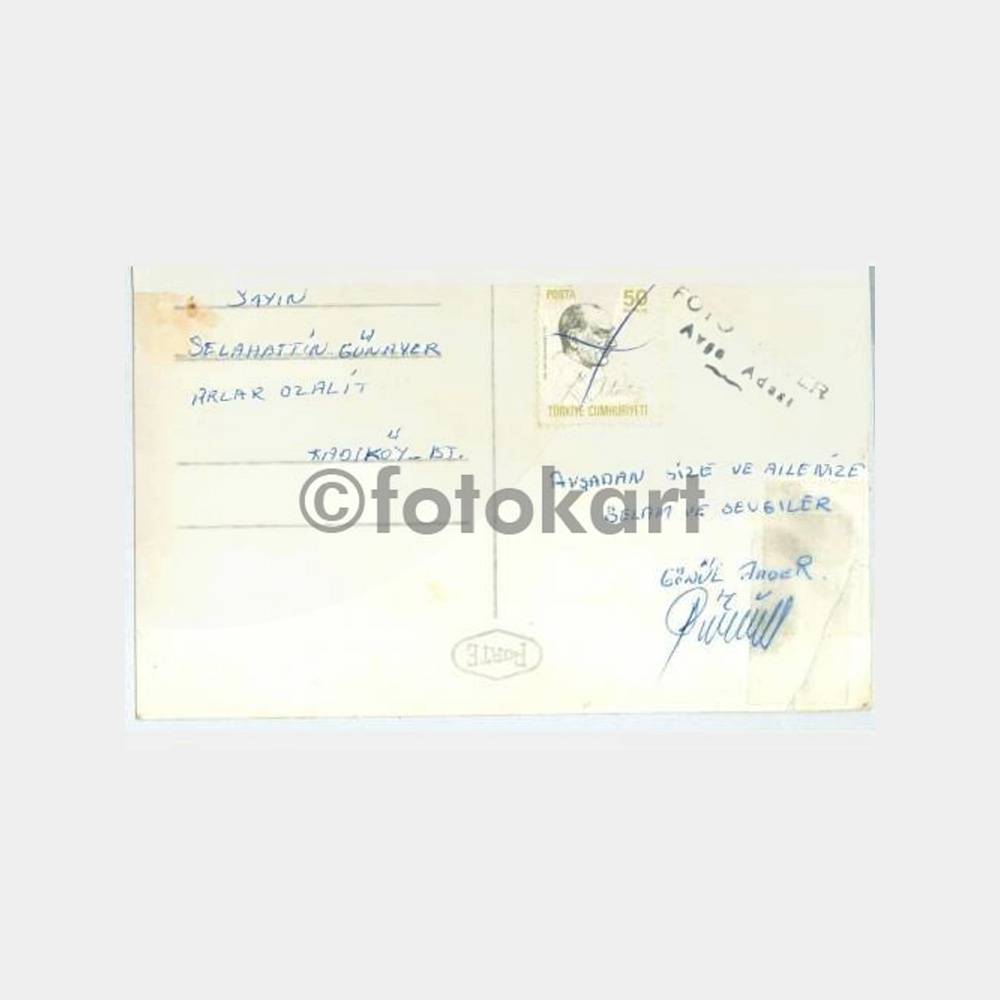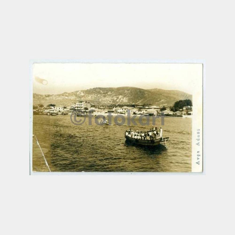 14 x 9 cm ebadında, arkası yazılı fotokart. Arkası Foto Enver damgalı. Marmara Adası’ndan Avşa’ya motorla geçen ziyaretçiler görünüşü. Sol alt kırık yeri bantlı durumda, haliyle.