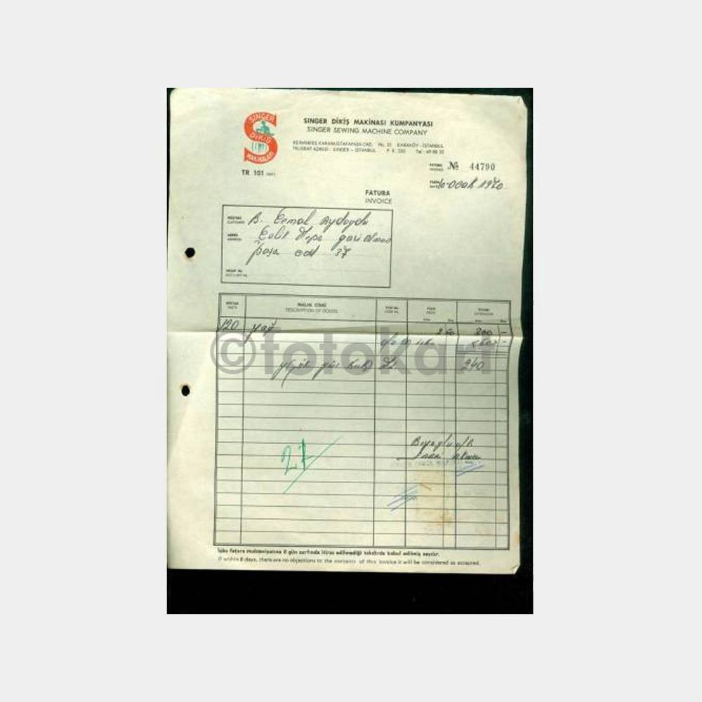 1970 Singer Dikiş Makinesi Kumpanyası Fatura